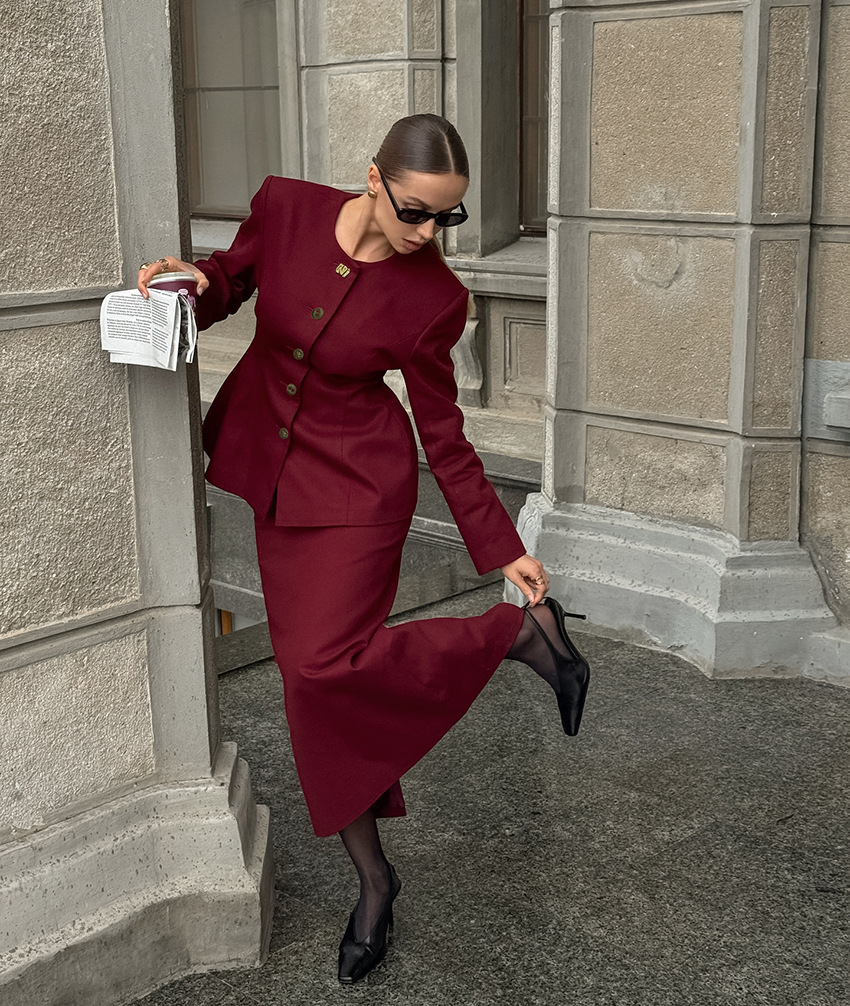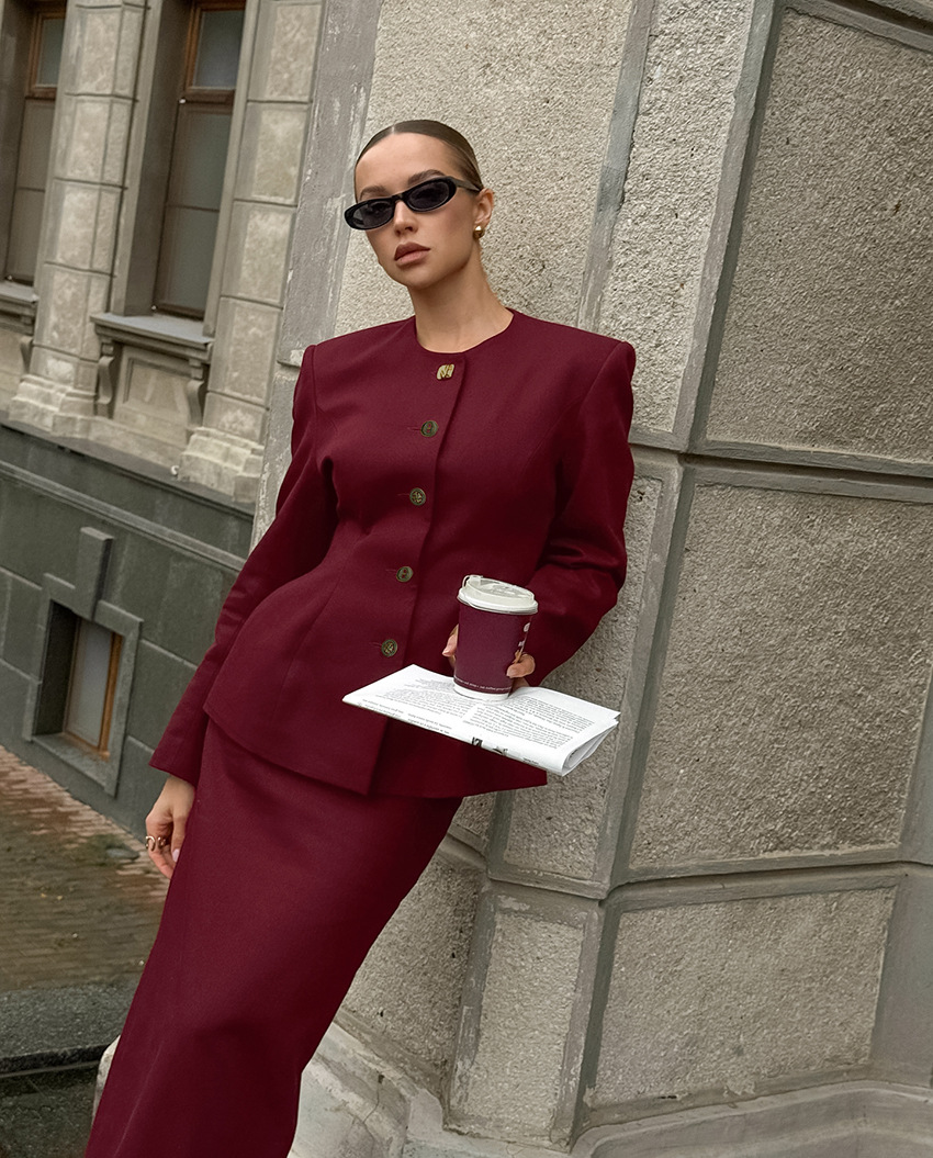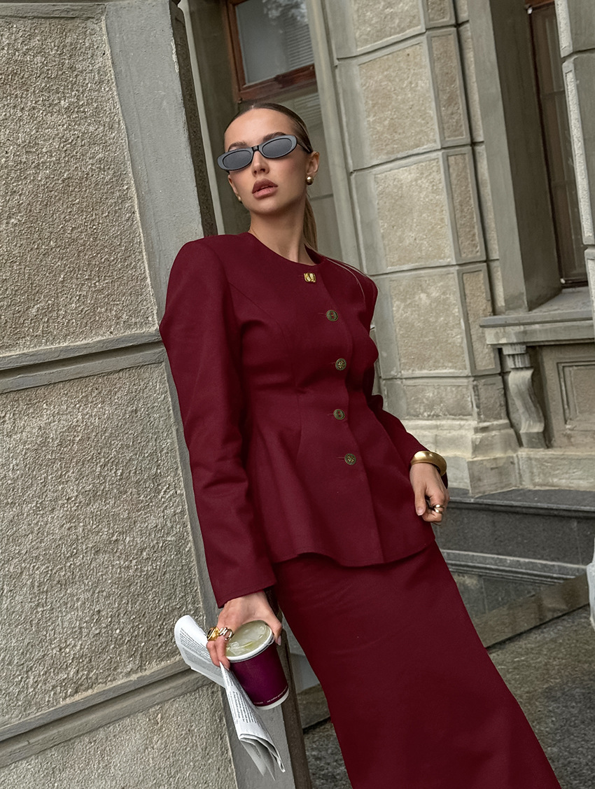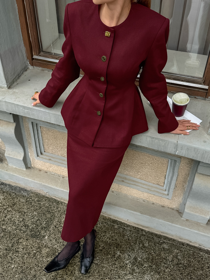 Round-neck Long-sleeved Jacket With Slit Skirt Women's Fashion Casual Two-piece Set