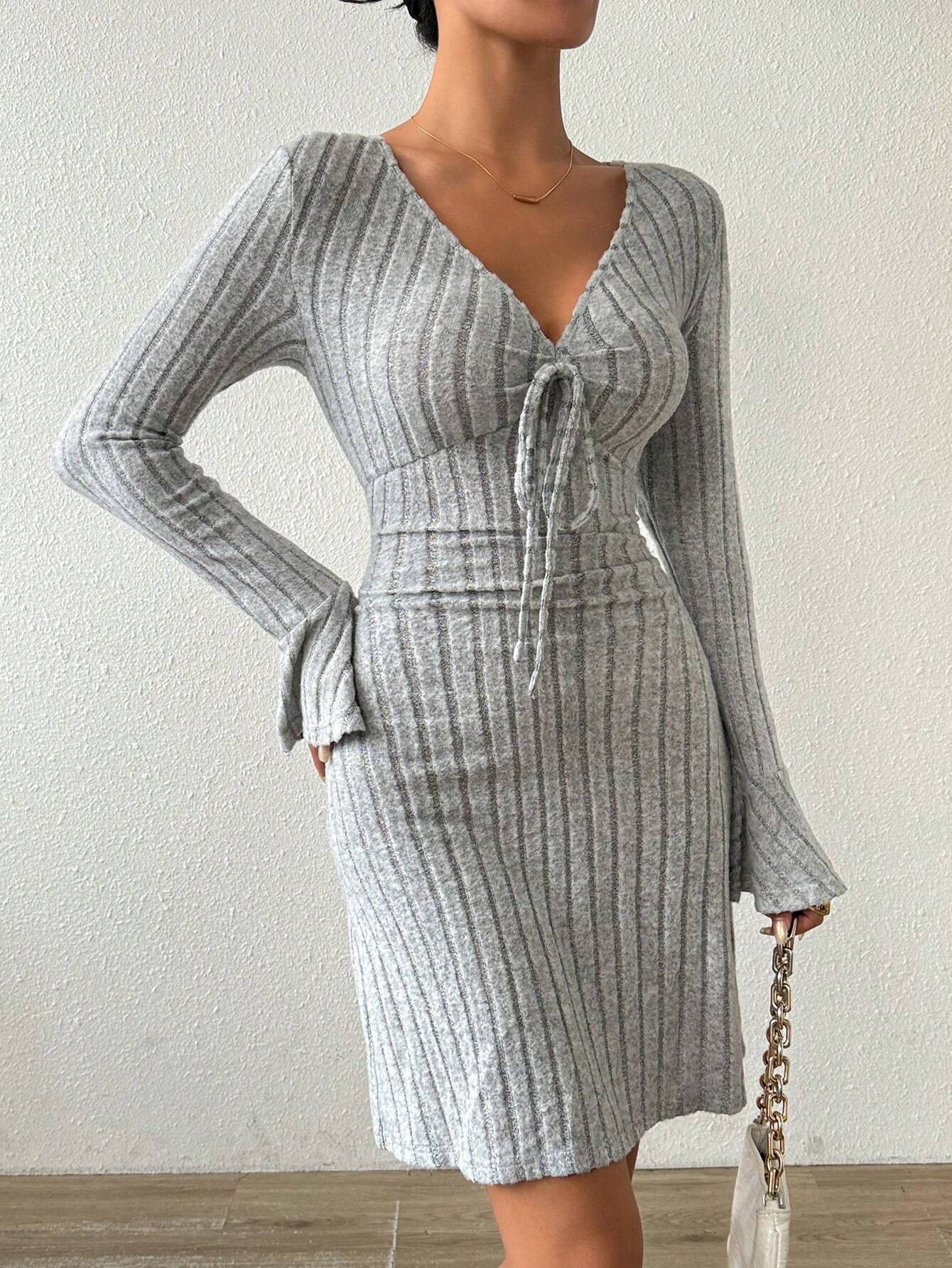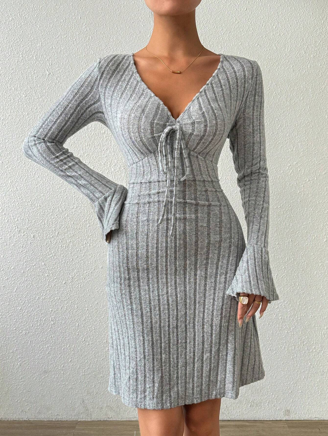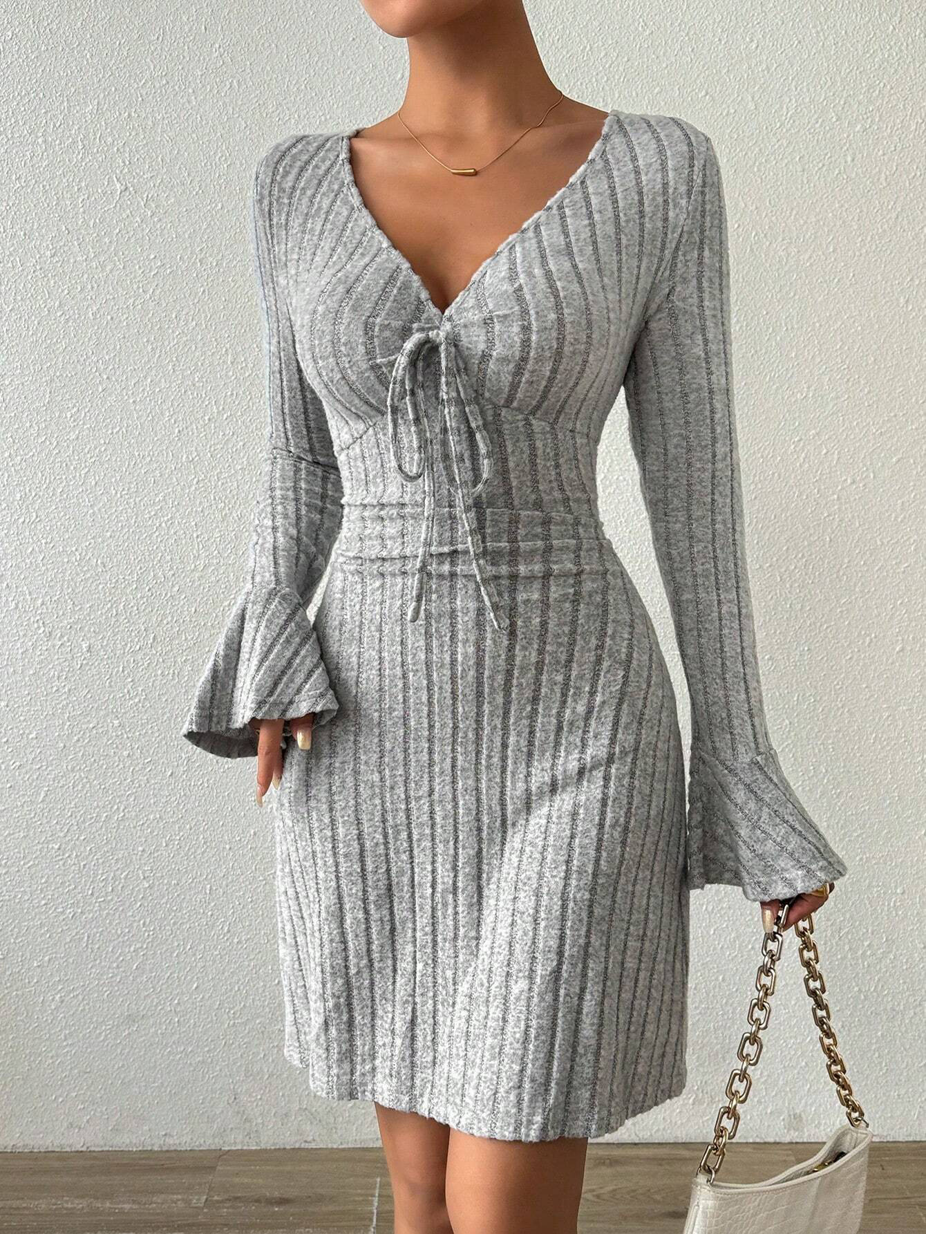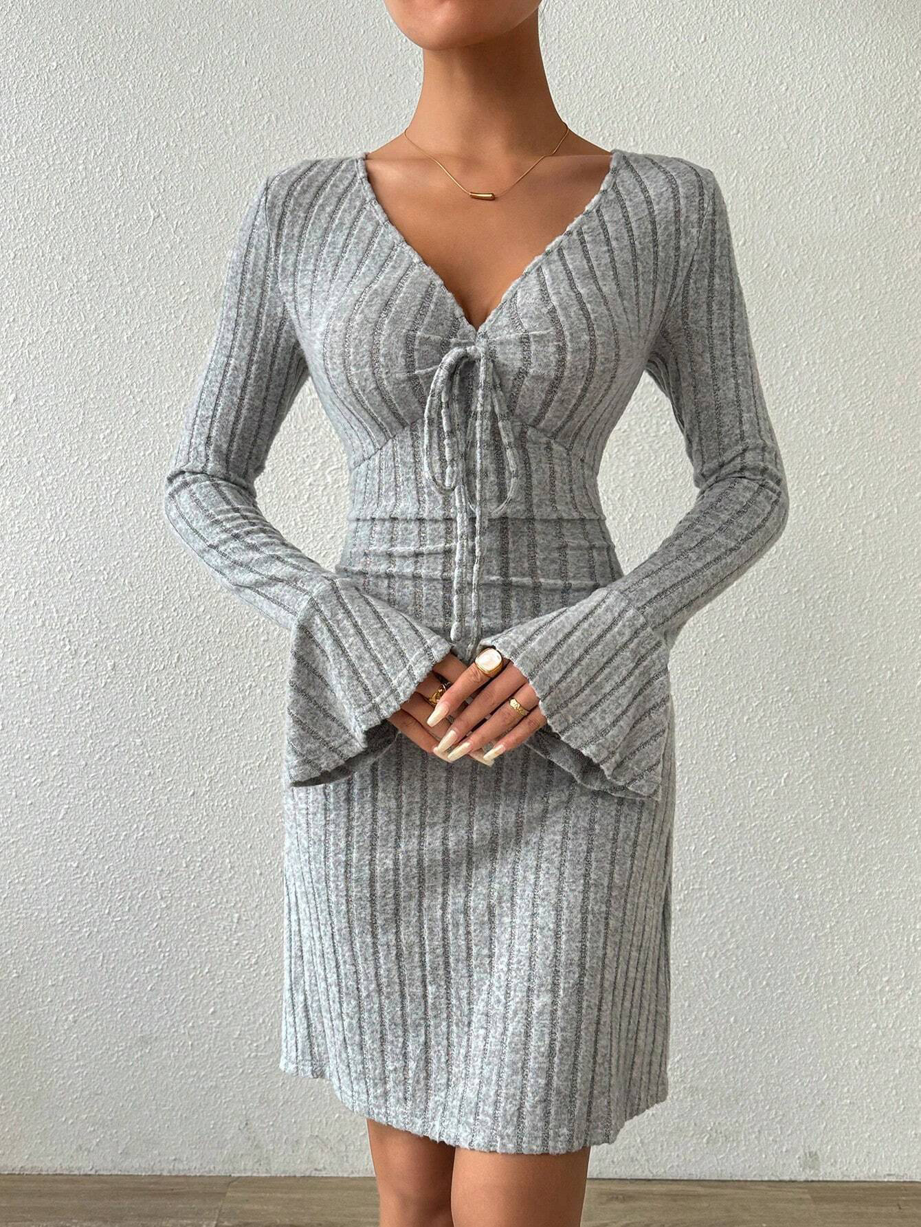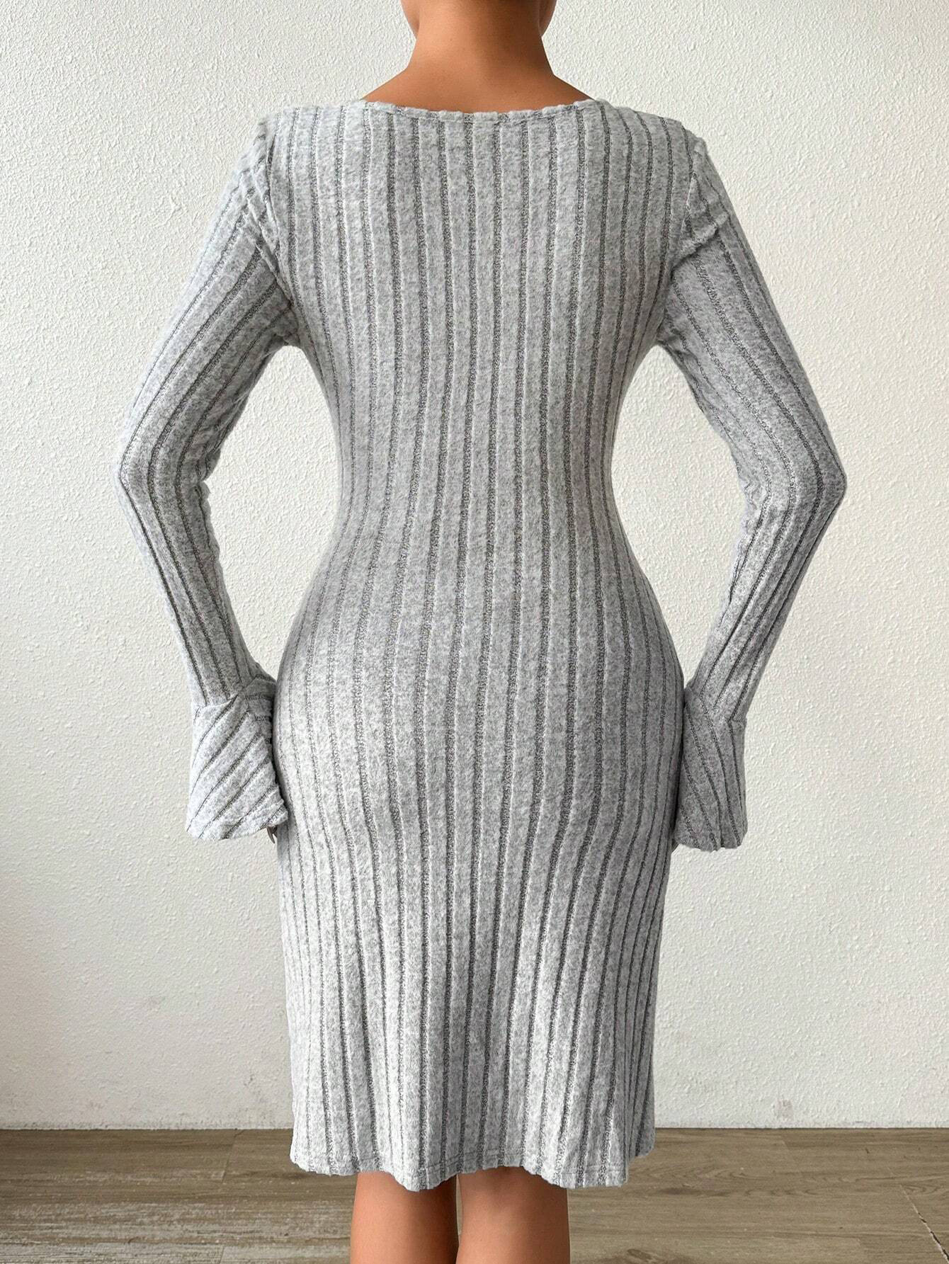 Women's Simple And Elegant Gray Dress With Flared Sleeves And Slim-fit Short Skirt